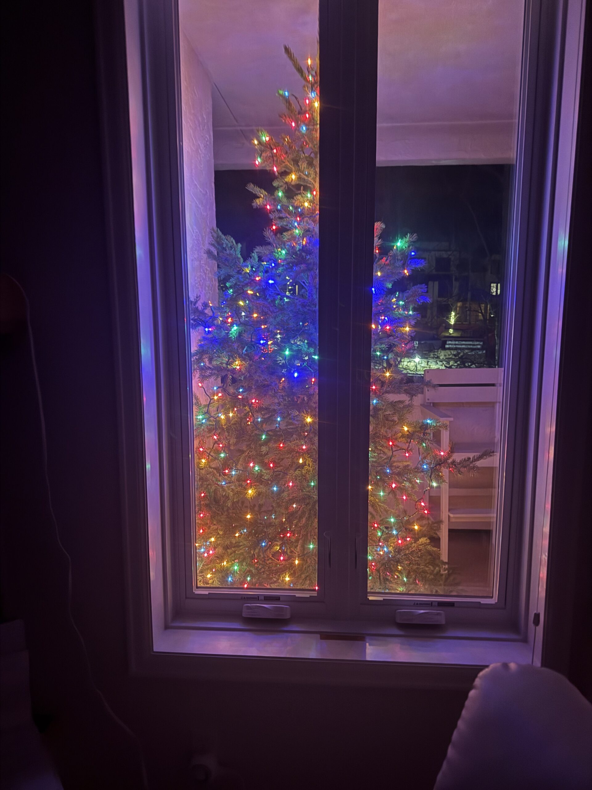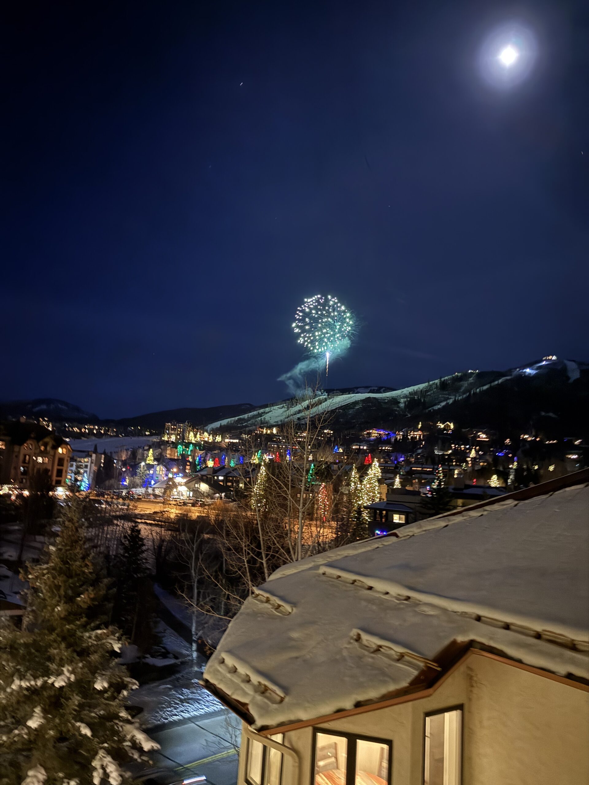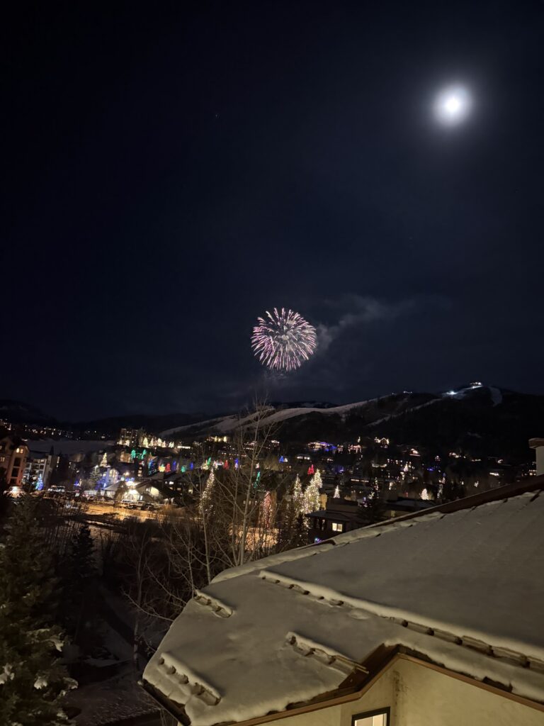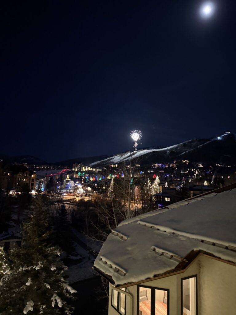 We returned from dinner on New Year’s Eve just in time to watch the ski parade (notice the red lights in the picture below) and fireworks from our condo window.